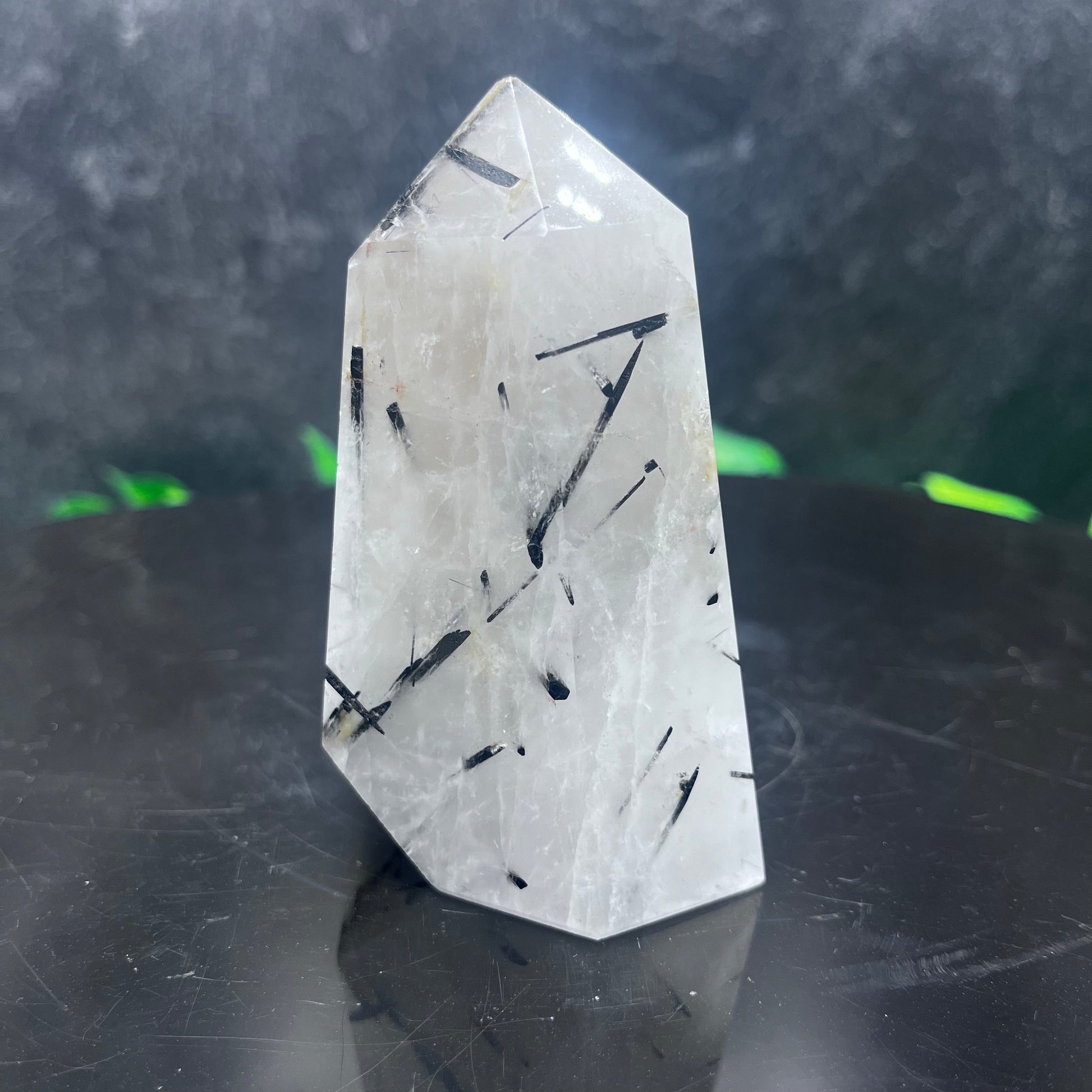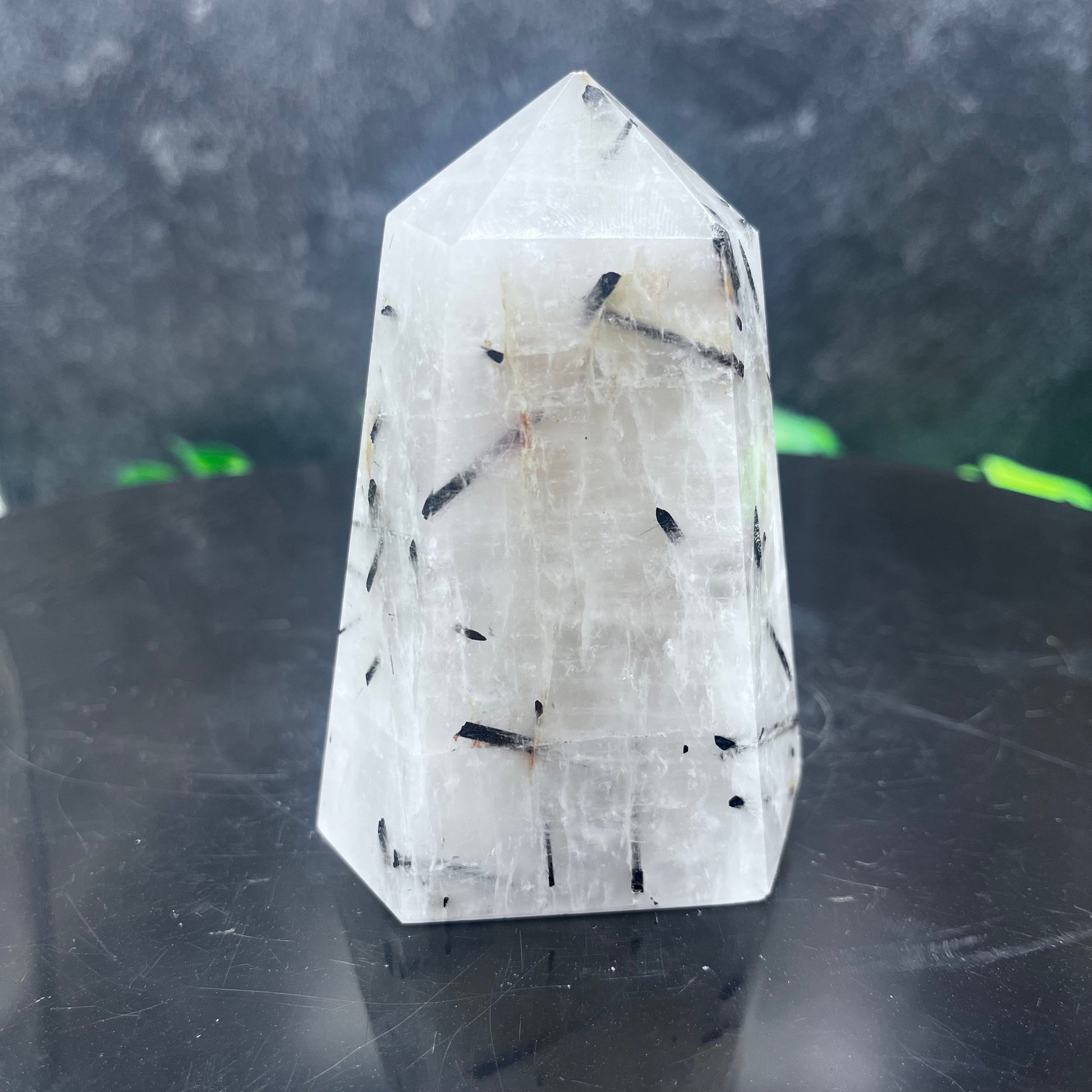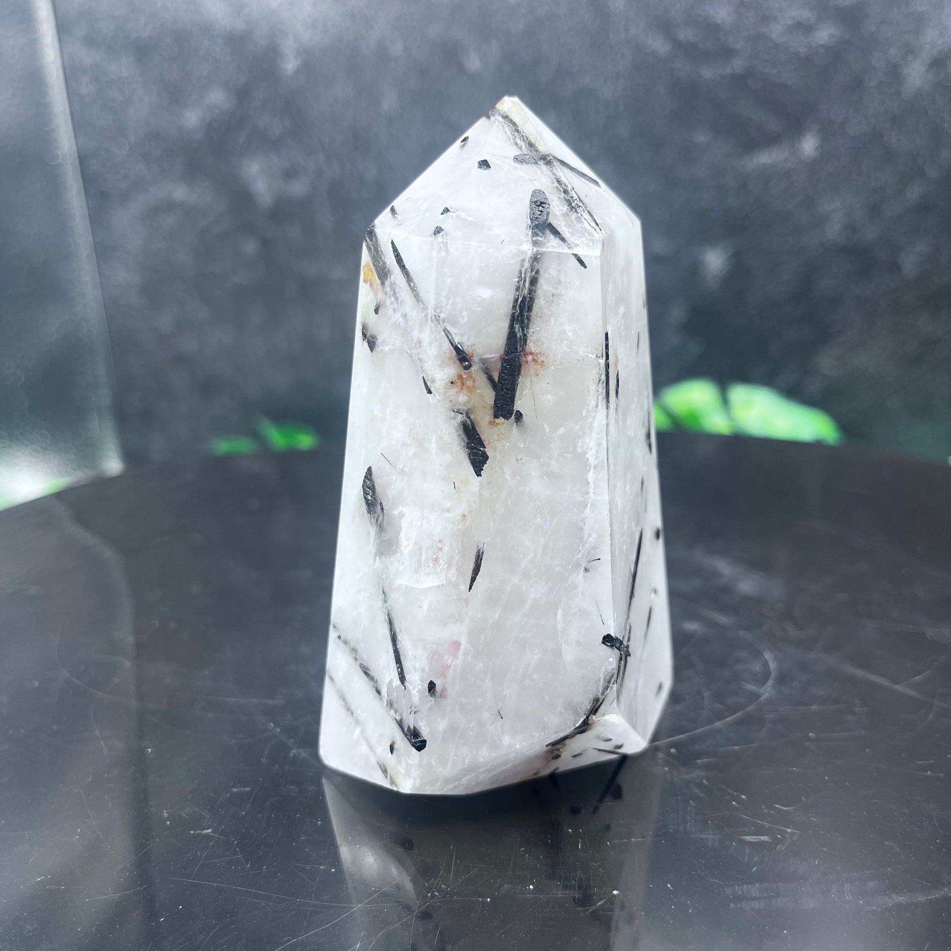 Enhance your home's decor with this unique and luxurious black tourmaline in quartz tower. This natural stone is perfect for adding a touch of sophistication and elegance to any room. The black tourmaline is sure to be a conversation piece, adding an exclusive aura to your living space.
