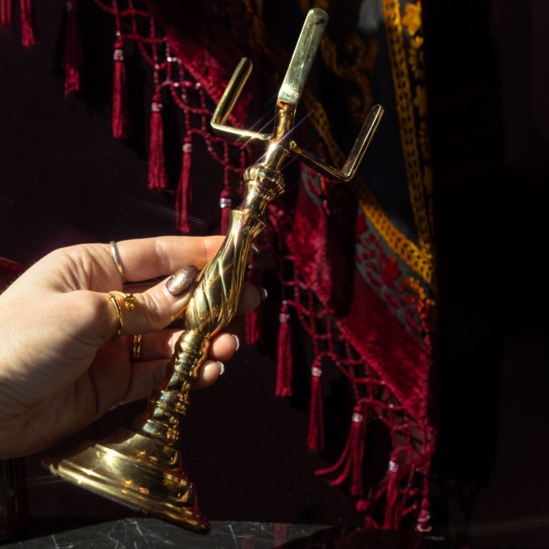 Let your crystal generators, obelisks, and spheres shine at their fullest with this Brass Gemstone Display Stand. This antique-style brass stand features three tall prongs designed to gently cradle and showcase your favorite pieces. Display stands play an important role in spiritual work — they provide a dedicated, safe space for your most precious gems.
