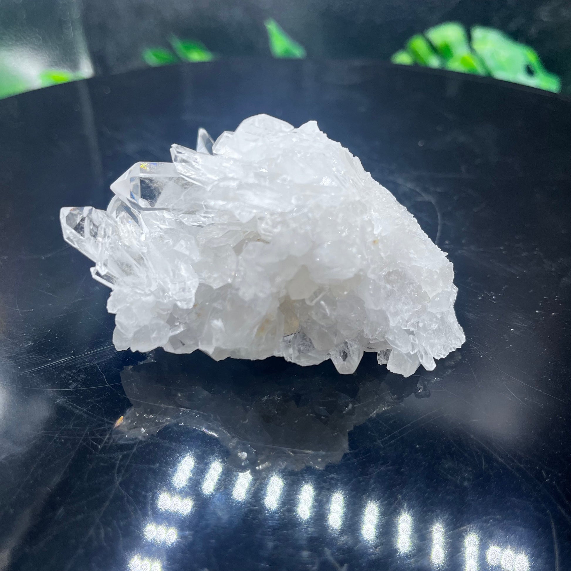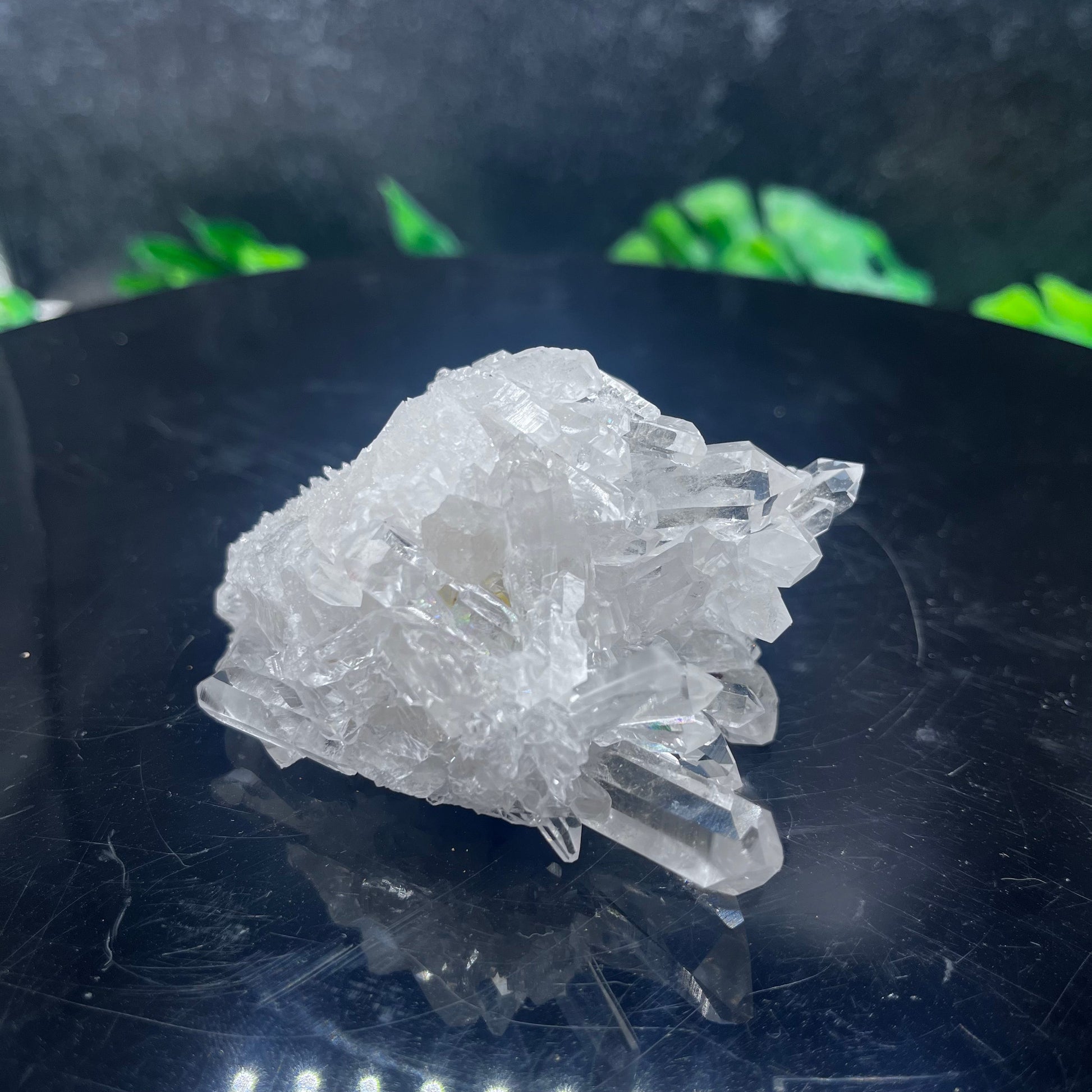 This crystal quartz from nature's own hands is a luxurious piece of décor. Sleek and shining, its translucence reflects the light and captures the eye. Whether gracing a shelf, mantle, or window sill, this Arkansas Clear Quartz Cluster will add a touch of class to any room.