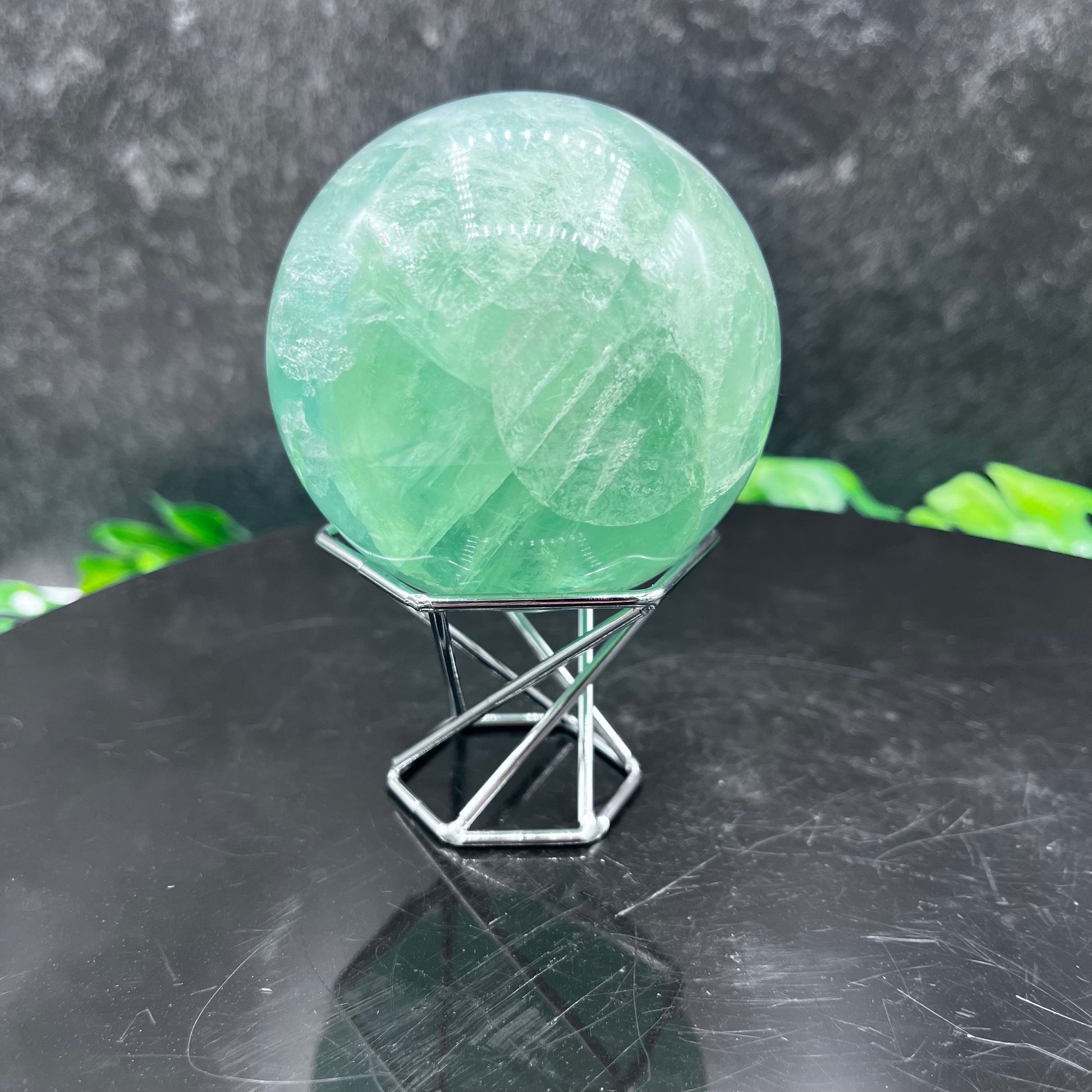 Gorgeous in its unique hue and hand-polished shine, this Green Fluorite Sphere adds a touch of tranquil beauty to any room. Its gemstone-like surface reflects light delicately, completing its refined and luxurious look.