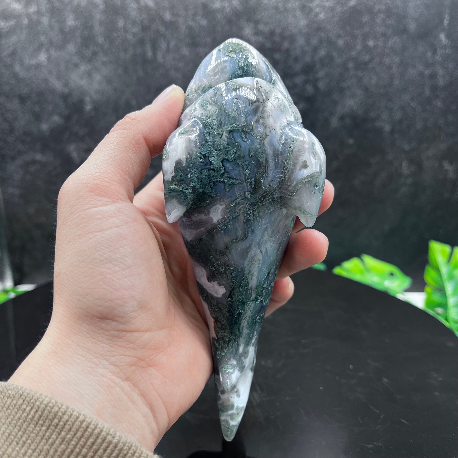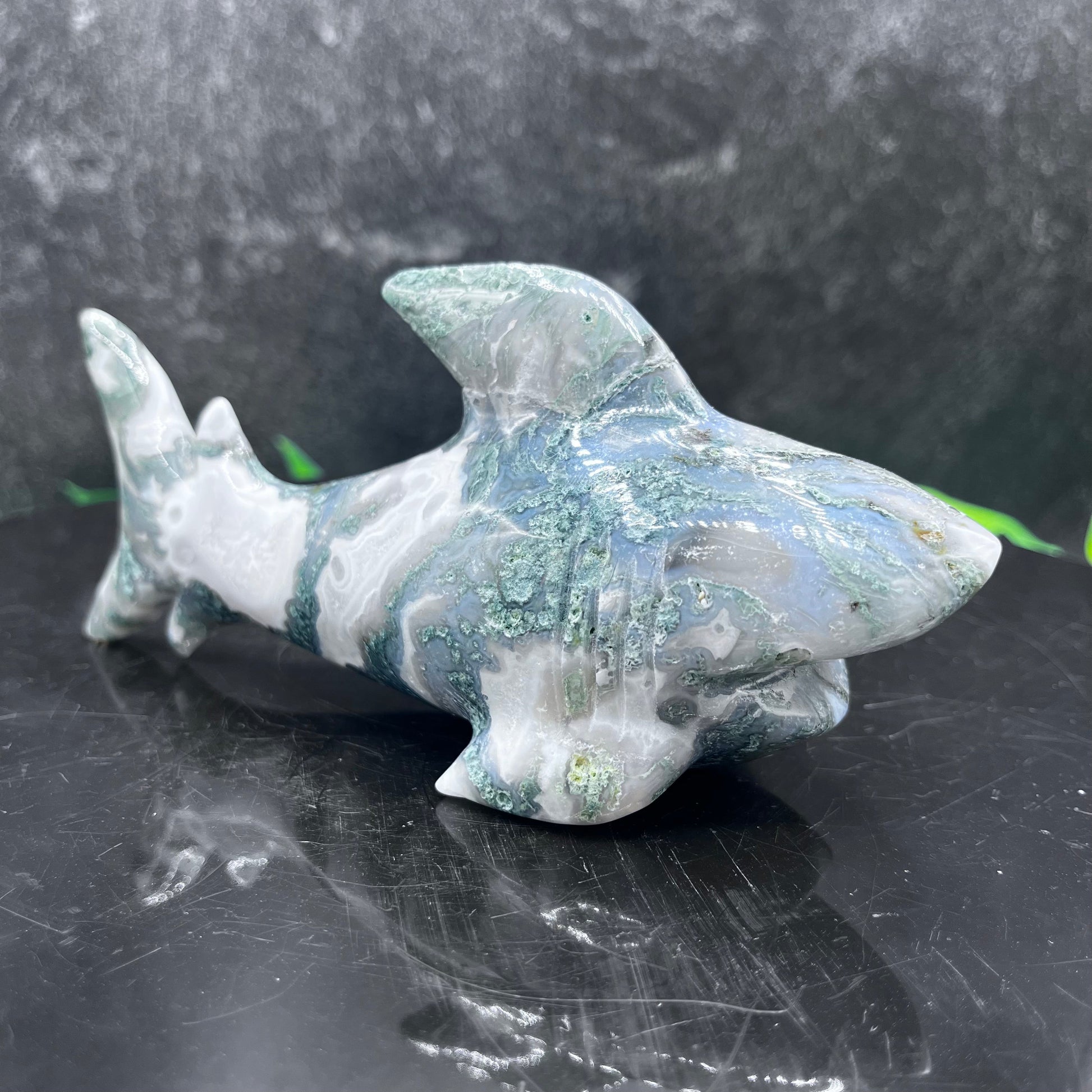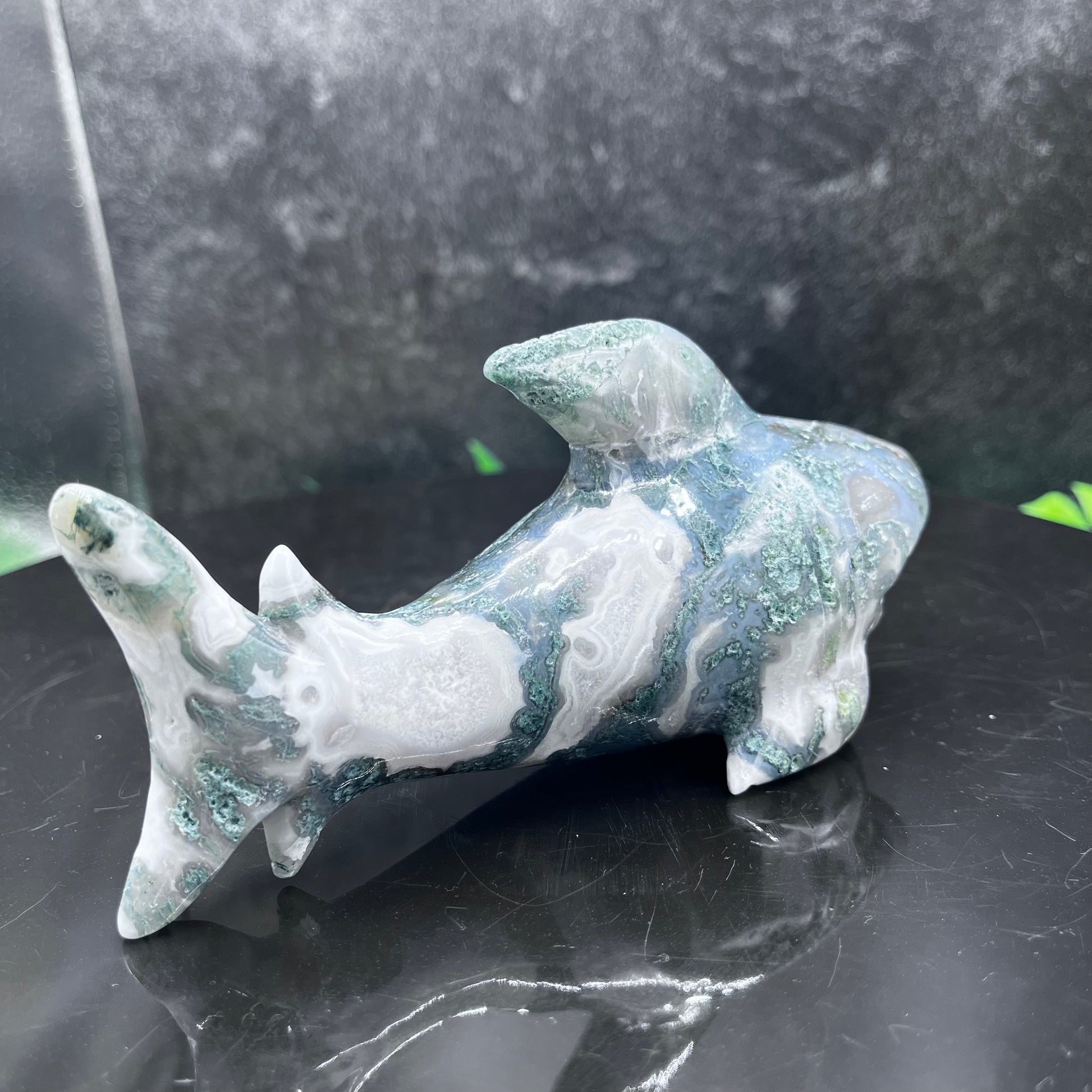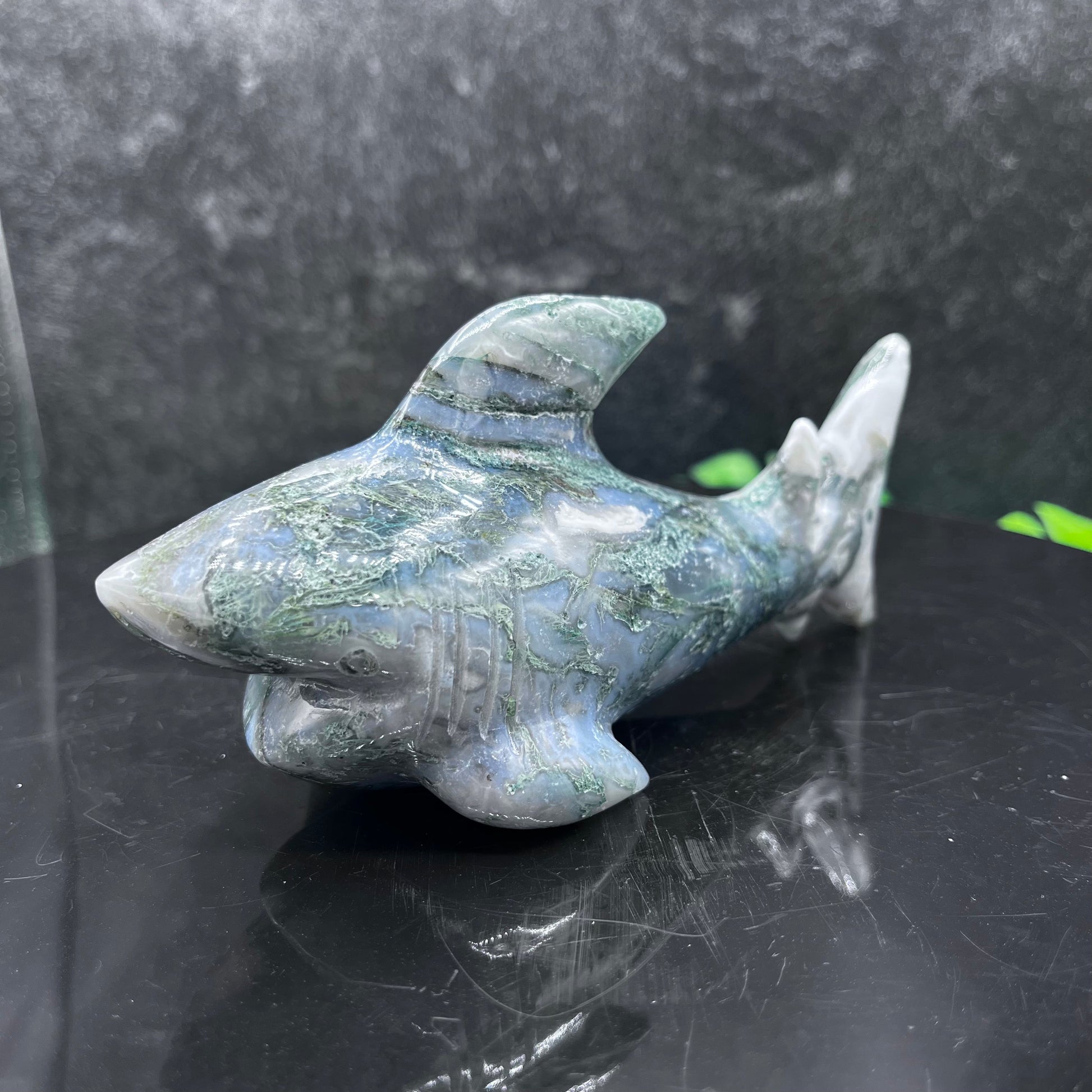 This unique piece of art is a luxury item crafted from exquisite moss agate. The magma-green stone is intricately carved into a stunning shark figurine, adding a touch of seaside magic to any interior. The perfect addition to any home décor, this timeless treasure will bring a touch of opulence and beauty to any room.