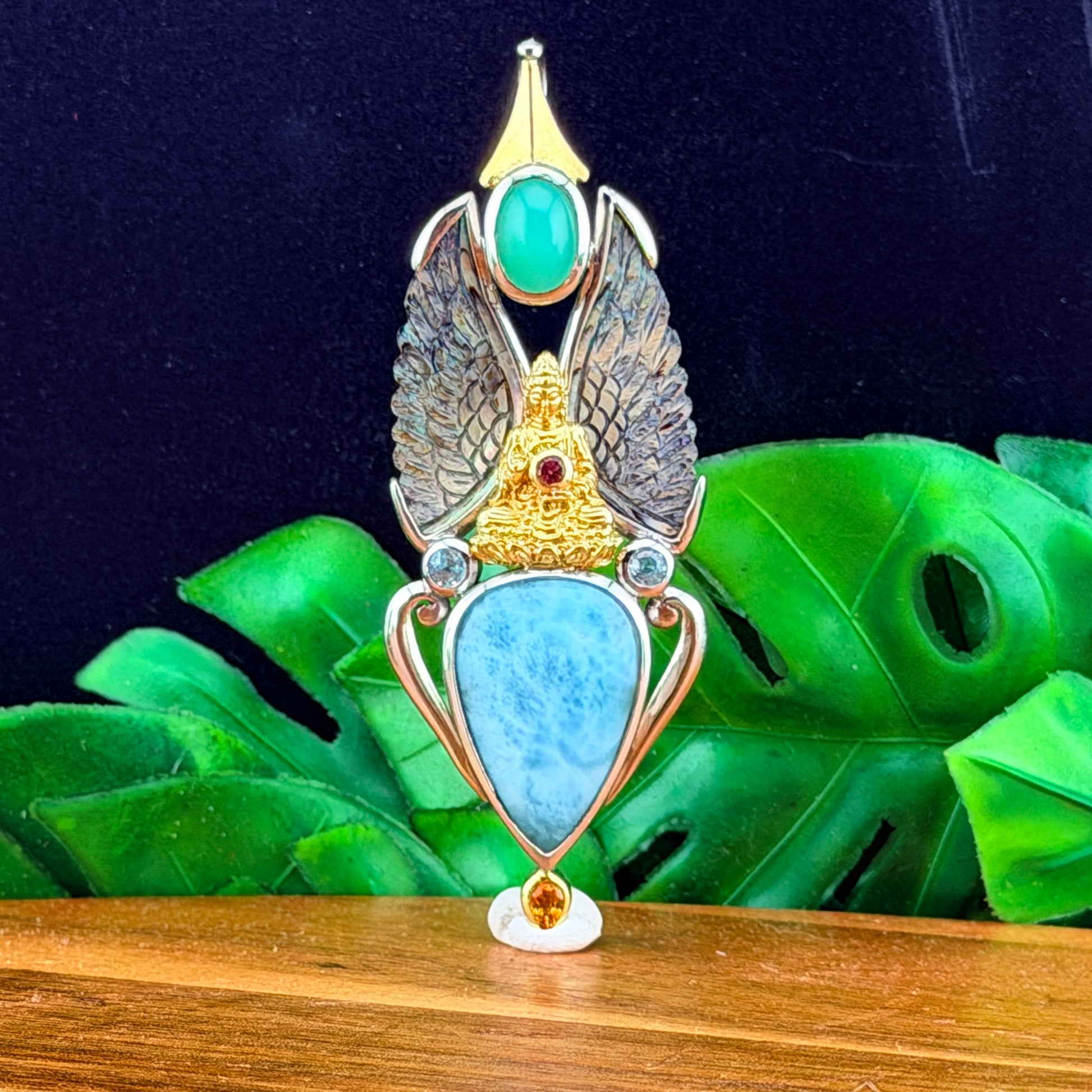 This piece contains: Larimar, Pink Tourmaline, Aquamarine, Topaz & Chrysoprase