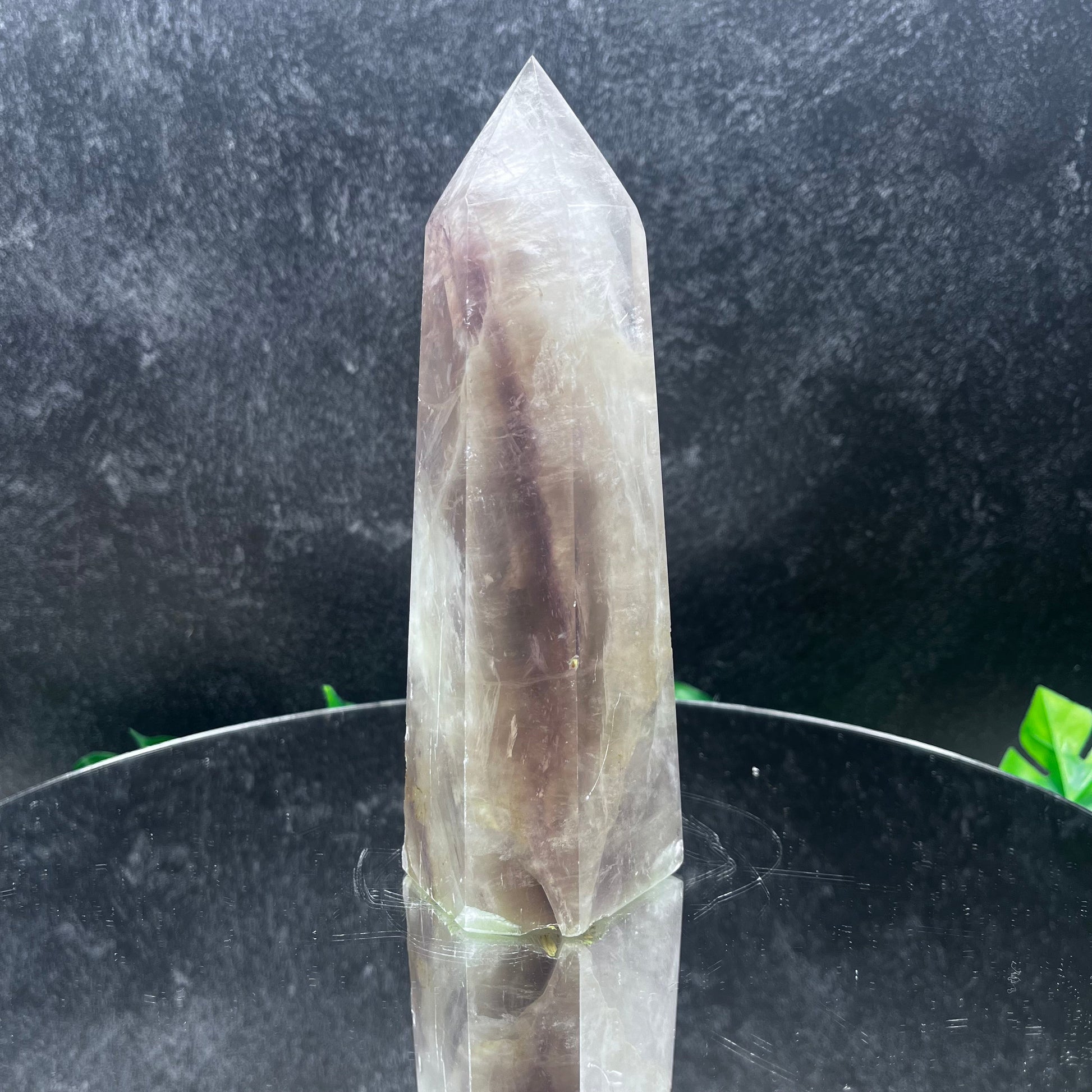 Treat yourself to this exclusive Smoky Purple Fluorite Tower! Its one-of-a-kind smoky hue and eye-catching shape will have you 'towering' over your fellow crystal collectors. With its metallic luster and mesmerizing color, you'll feel like royalty!