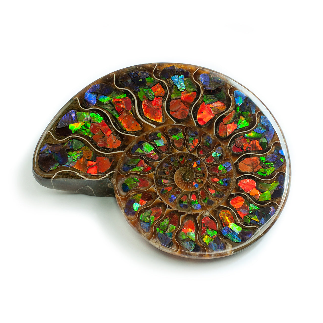 - This genuine half Ammonite features chambers meticulously hand-inlaid with vivid Ammolite, showcasing a remarkable gradient of colors transitioning from blue to green and finally to red towards the center. Offered as either the left or right half, this piece showcases a precise balance of color and natural fossil structure.